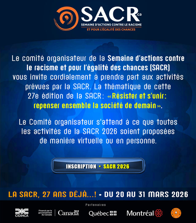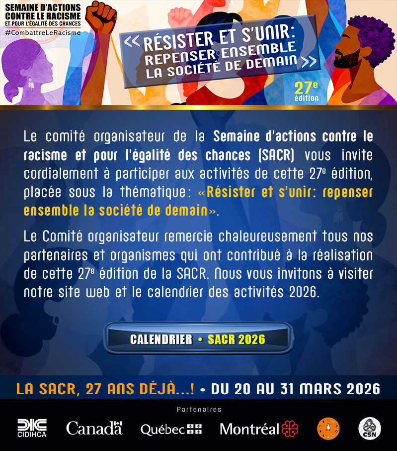 The SACR organizing committee warmly invites you to take part in the activities planned for the 2026 edition (registration page). We encourage the submission of proposals for activities, whether virtual or in-person, to promote wide participation. Join us and help make this week a powerful moment of awareness and change for a more just and inclusive Quebec.