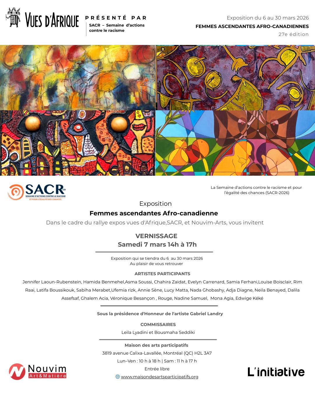 Description de l'activité : Le CIDIHCA-SACR en partenariat avec Vue D'Afrique et la Maison des arts participatifs présente l’exposition « Afro-descendances », un projet réunissant douze femmes artistes aux parcours pluriels, dans le cadre de la SACR-2026, dont le thème de la 27ᵉ édition est : « Résister et s’unir : repenser ensemble la société de demain ».