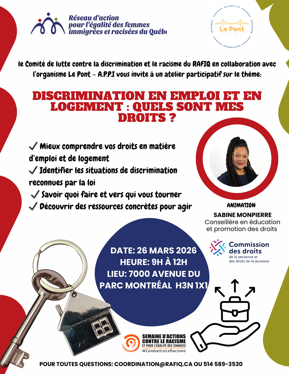 Description de l'activité : Dans le cadre de la 27e édition de la Semaine d’actions contre le racisme, le Comité de lutte contre la discrimination et le racisme du RAFIQ en collaboration avec Le Pont – A.P.P.I vous invite à un atelier participatif : Discrimination en emploi et en logement : quels sont mes droits ?