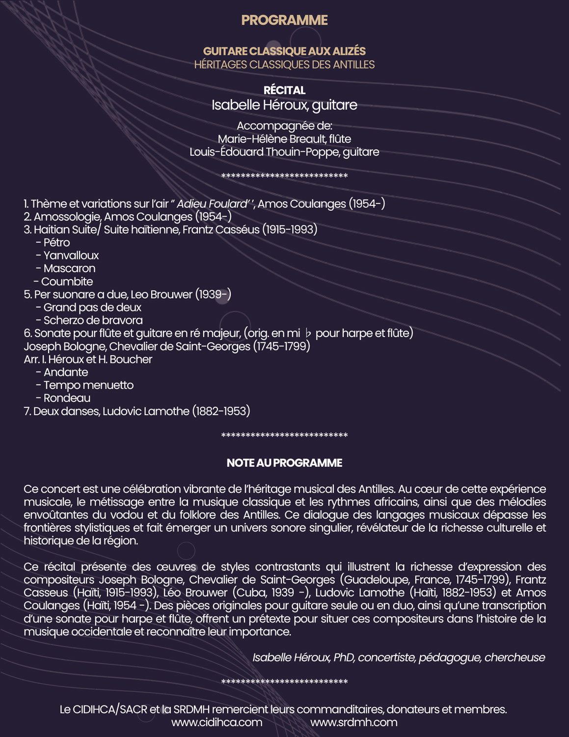 Ce récital présente des œuvres de styles contrastants qui illustrent la richesse d'expression des compositeurs Joseph Bologne, Chevalier de Saint-Georges (Guadeloupe, France, 1745-1799), Frantz Casseus (Haïti, 1915-1993), Léo Brouwer (Cuba, 1939-), Ludovic Lamothe (Haïti, 1882-1953) et Amos Coulanges (Haïti, 1954-). Des pièces originales pour guitare seule ou en duo, ainsi qu'une transcription d'une sonate pour harpe et flûte, offrent un prétexte pour situer ces compositeurs dans l'histoire de la musique occidentale et reconnaître leur importance.