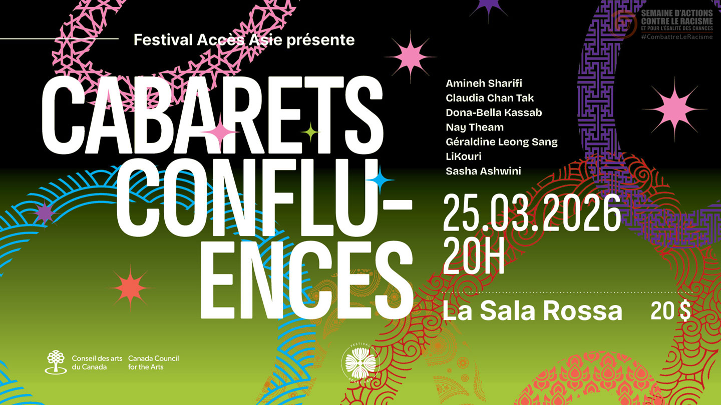 Description de l'activité : Le Cabaret Confluences #3 présente Amineh Sharifi avec un extrait de J’ai perdu ma langue, pièce bilingue français-persan explorant l’identité et la langue. Suivi du trio mêlant poésie et musique composé de Claudia Chan Tak, Géraldine Leong Sang et Nay Theam. Sasha Ashwini, danseuse Bharatanatyam, propose une exploration de l’identité et des questions décoloniales. LiKouri, chanteuse née au Canada, dont la mère est d’origine indienne adoptée par une famille libanaise, partagera ses créations musicales.