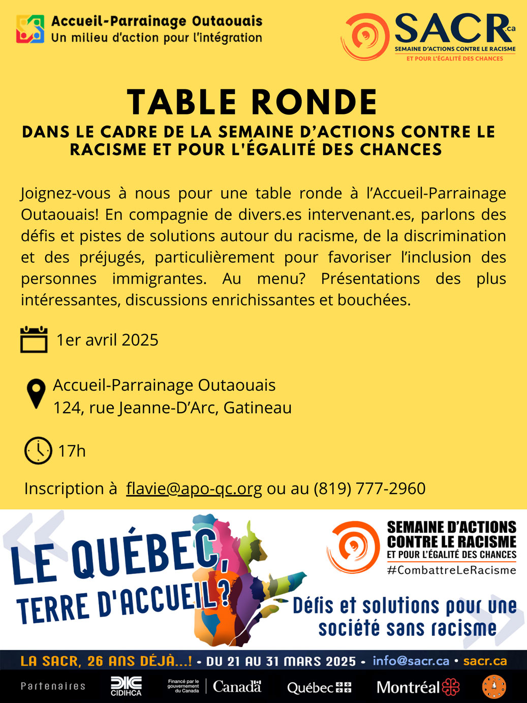 Description de l'activité : Joignez-vous à nous pour une table ronde à l’Accueil-Parrainage Outaouais! En compagnie de divers.es intervenant.es, parlons des défis et pistes de solutions autour du racisme, de la discrimination et des préjugés, particulièrement pour favoriser l’inclusion des personnes immigrantes.