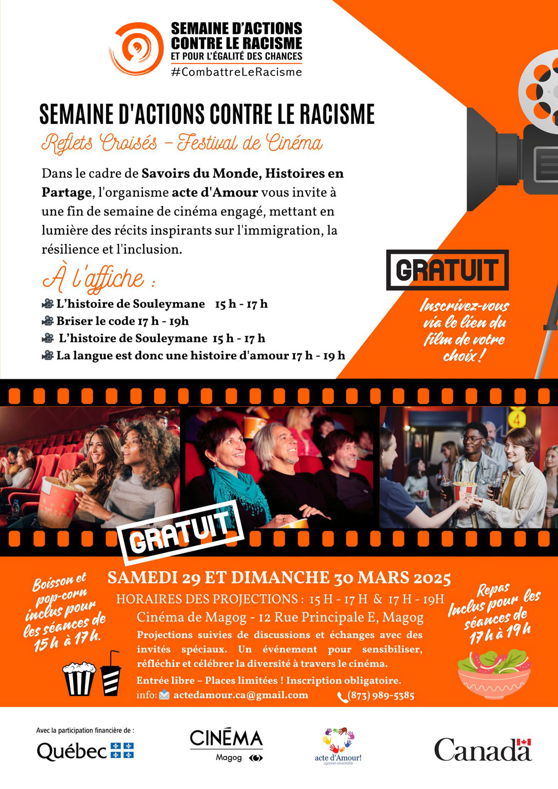 Description de l'activité : Reflets Croisés – Festival de cinéma par l'organisme acte d’Amour. Un festival où le cinéma ouvre le dialogue et éclaire les réalités de notre société. À travers L’histoire de Souleymane, Briser le code et La langue est donc une histoire d’amour, plongez dans des récits puissants sur l’identité, la diversité et l’inclusion. Chaque projection est suivie d’une discussion, pour échanger et réfléchir ensemble. Un rendez-vous cinématographique à ne pas manquer !