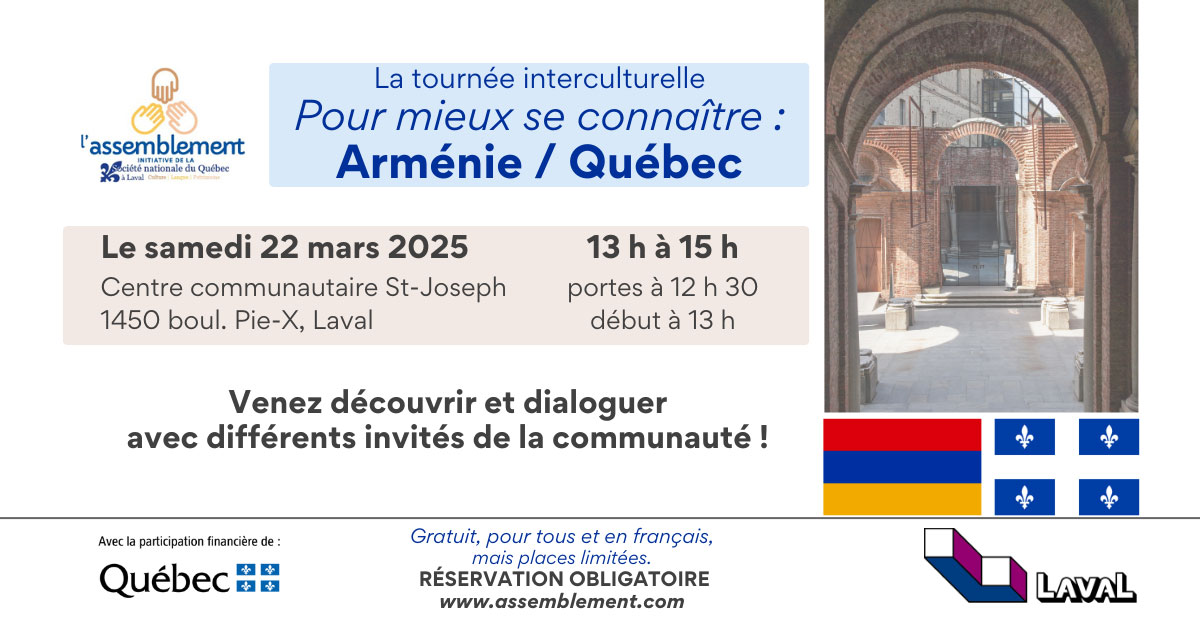 Description de l'activité : La communauté arménienne de Laval, en collaboration avec l'assemblement, une initiative de dialogue interculturelle sous l'égide de la Société nationale du Québec à Laval (SNQ Laval), vous convie à la rencontre et l'échange avec cette culture qui enrichit notre société.