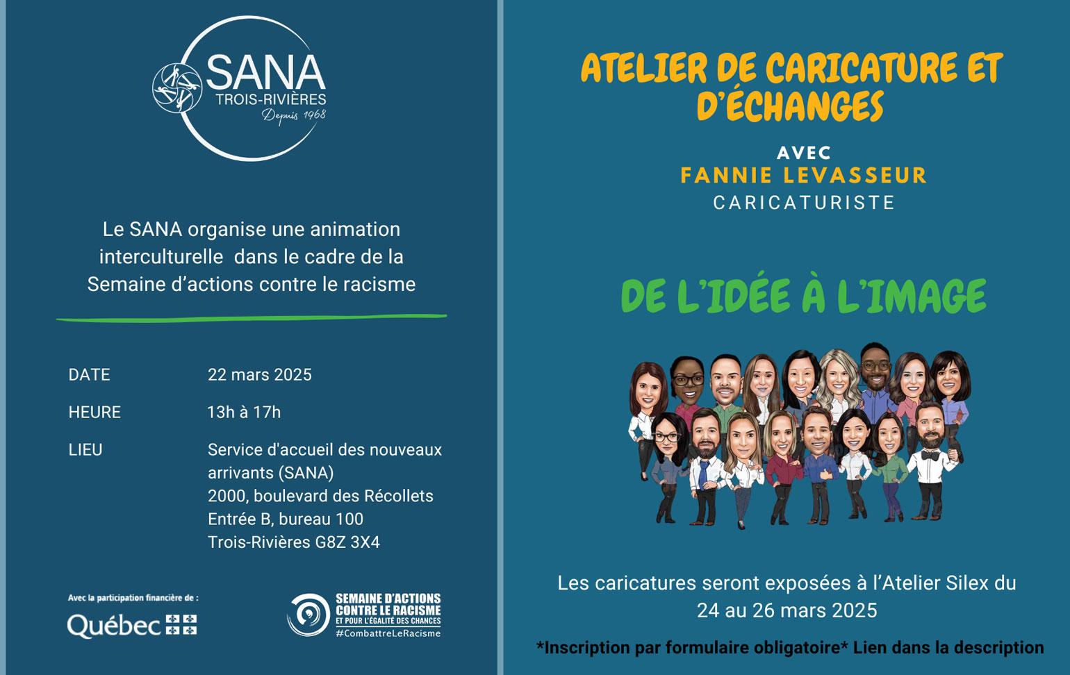 Description de l'activité : Dans le cadre de la 𝗦𝗲𝗺𝗮𝗶𝗻𝗲 𝗱’𝗮𝗰𝘁𝗶𝗼𝗻𝘀 𝗰𝗼𝗻𝘁𝗿𝗲 𝗹𝗲 𝗿𝗮𝗰𝗶𝘀𝗺𝗲, le SANA de Trois-Rivières vous invite à un atelier de caricature et d’échanges (inscription obligatoire)