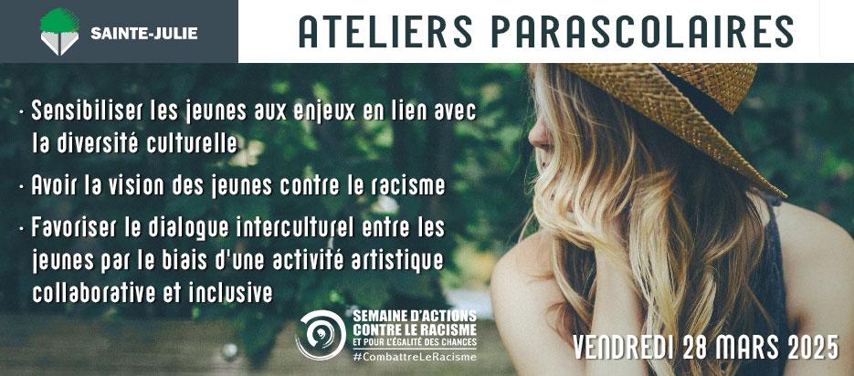 Description de l'activité : Dans le cadre de la Semaine d'actions contre le racisme qui aura lieu du 21 au 31 mars 2025, nous invitons des écoles de Sainte-Julie à participer à un atelier parascolaire de danse offert par Primadanse . L'atelier de médiation culturelle, propose donc la création d'une chorégraphie par les intervenants en collaboration avec les étudiants.