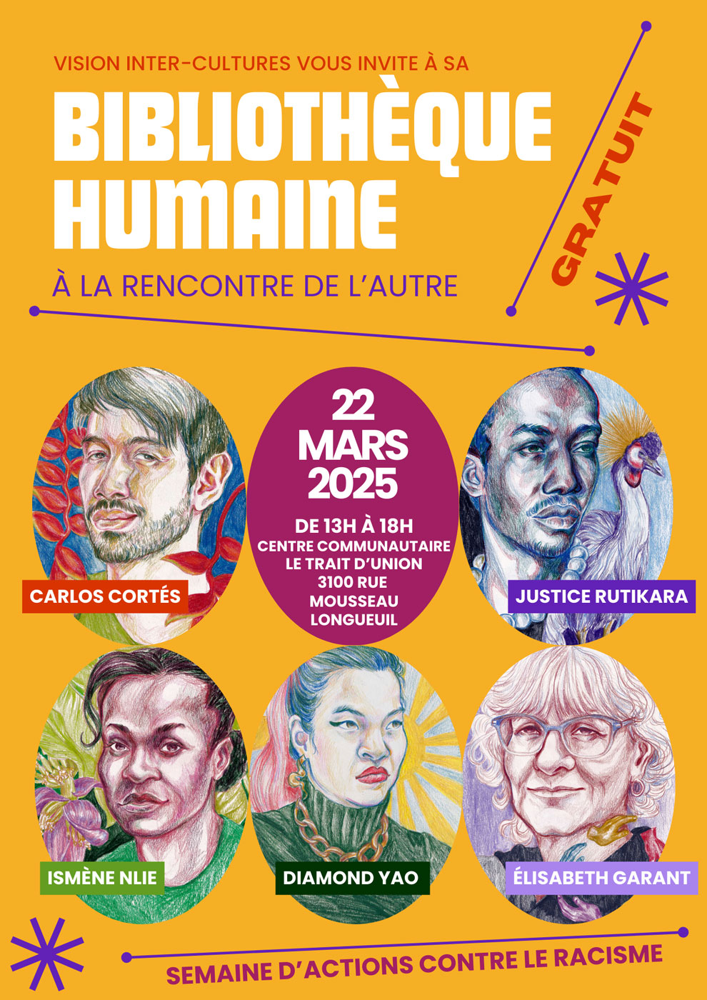 Description de l'activité : Venez vous entretenir avec des personnes aux parcours dignes d'un roman et leur poser vos questions dans un tête à tête intime. Dans le cadre de la Semaine d'Actions Contre le Racisme, Vision Inter-Cultures a invité 5 personnes à partager leur vécu pour promouvoir l'ouverture à l'autre.