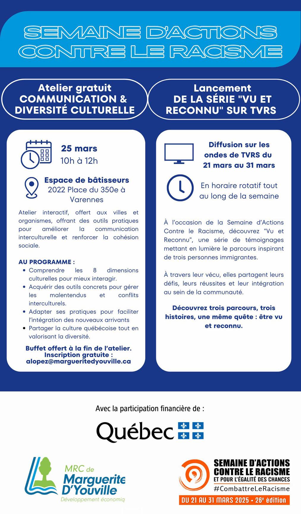 À l’occasion de la Semaine d’Actions Contre le Racisme, découvrez « Vu et Reconnu », une série de témoignages mettant en lumière le parcours inspirant de trois personnes immigrantes. À travers leur vécu, elles partagent leurs défis, leurs réussites et leur intégration au sein de la communauté. Diffusion sur les ondes de TVRS