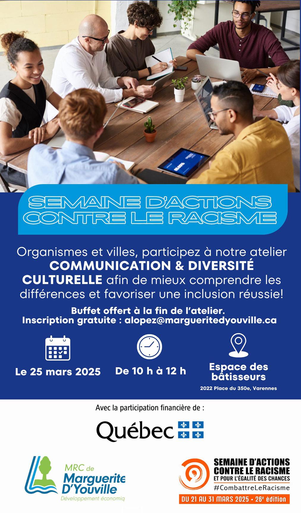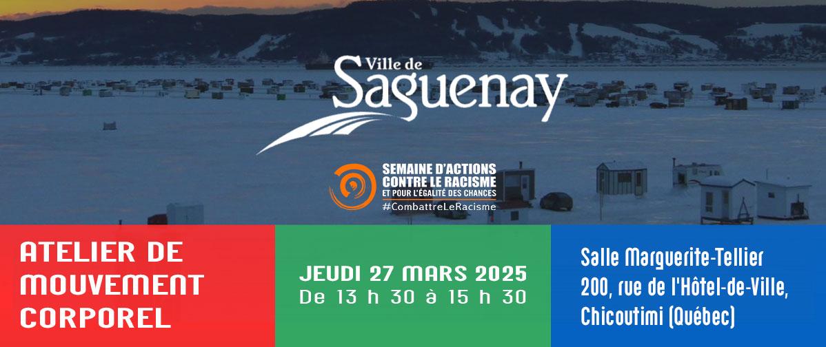 Description de l'activité : La Ville de Saguenay, dans le cadre de la Semaine d’actions contre le racisme, a le plaisir de vous inviter à un atelier de mouvement corporel. Date : Jeudi 27 mars 2025