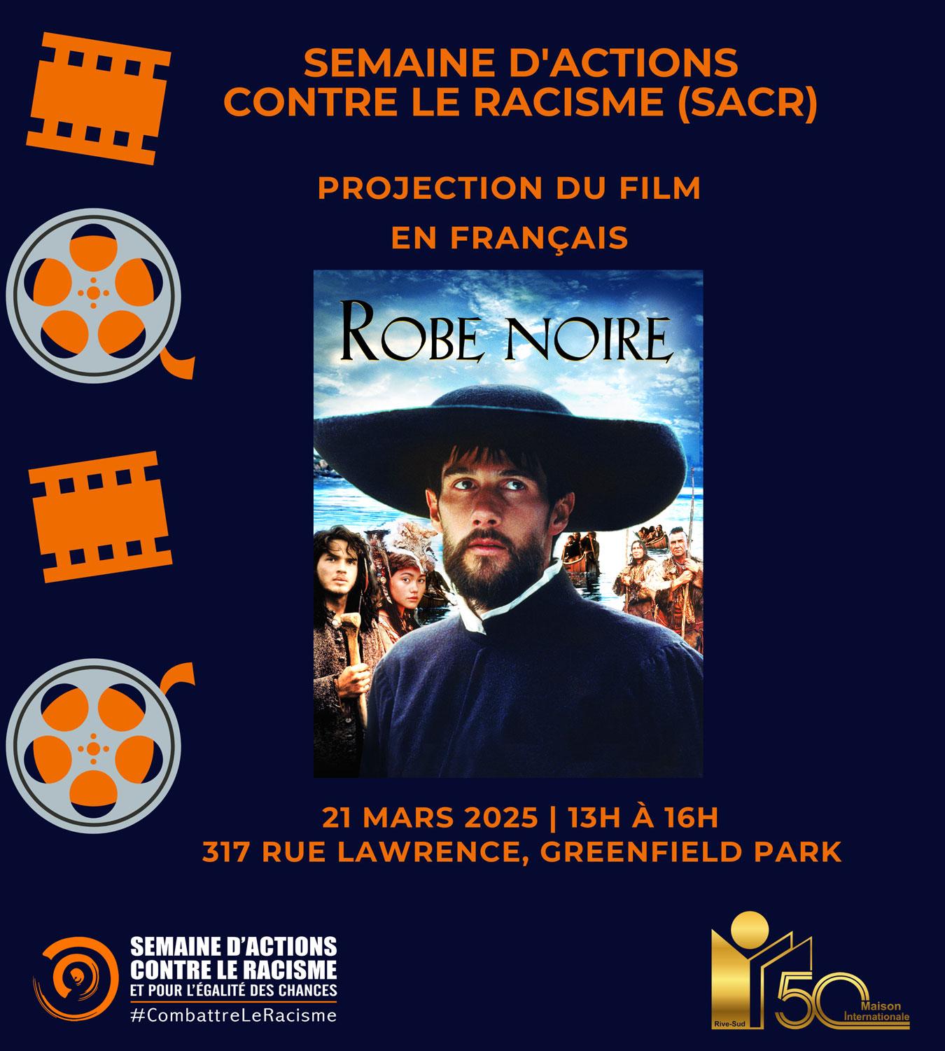 Description de l'activité : Le 21 mars, 317 rue Lawrence, dans notre succursale à Greenfield Park, aura lieu la projection du film « La Robe noire ». Le film met en lumière les injustices historiques vécues par les Autochtones à travers l'histoire du Canada et aborde des thèmes essentiels tels que le racisme systémique, la réconciliation et la justice sociale.
