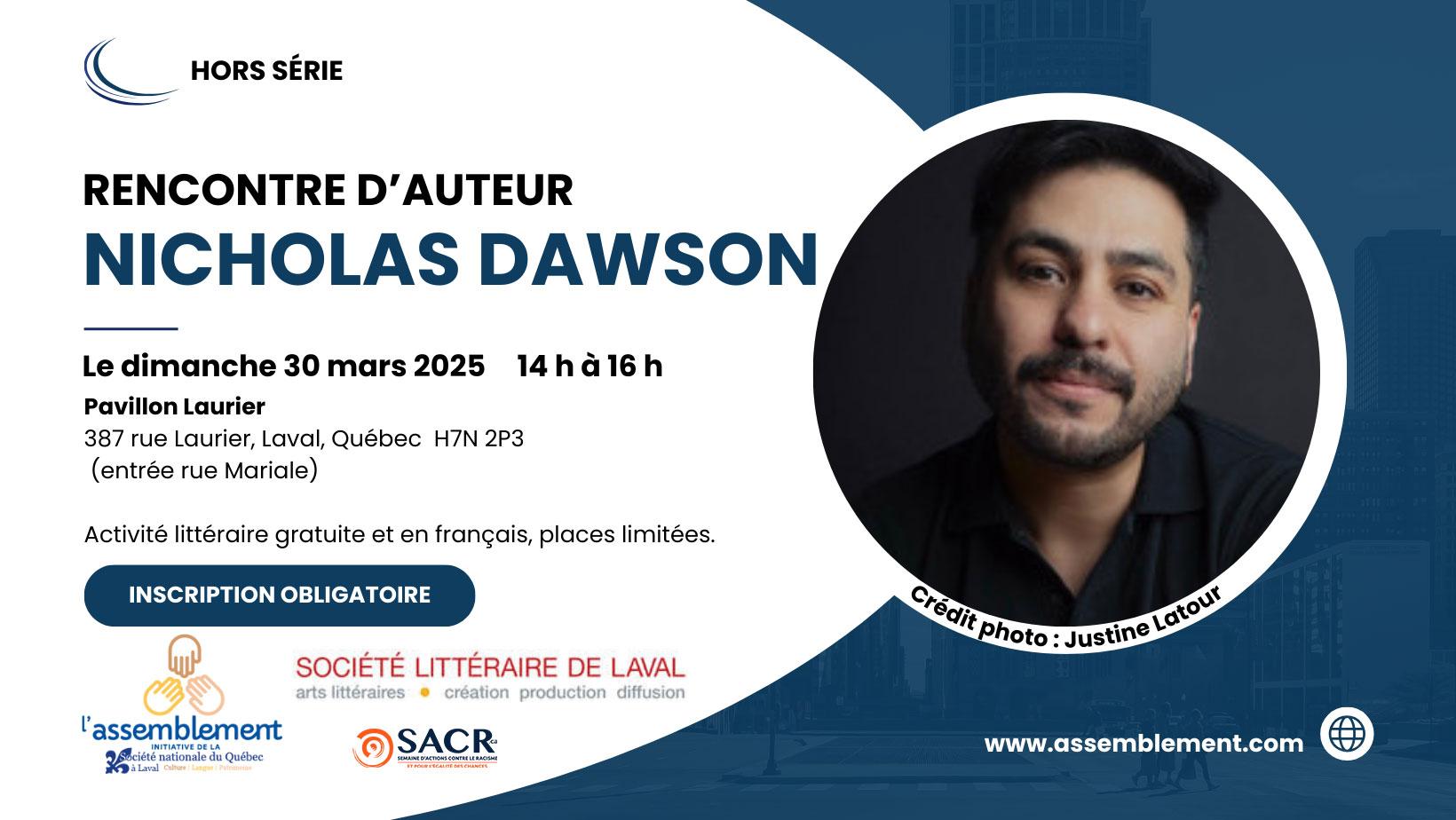Description de l'activité : L’assemblement s’associe à la Société littéraire de Laval qui présente une rencontre avec Nicholas Dawson, écrivain, artiste, éditeur et chercheur né au Chili en 1982, et dont l’histoire est liée à celle de sa sœur, l’écrivaine et sociologue Caroline Dawson, décédée le 19 mai 2024.