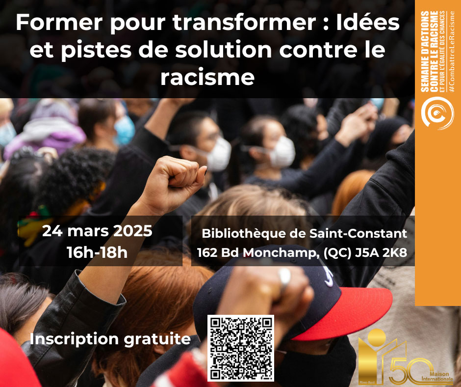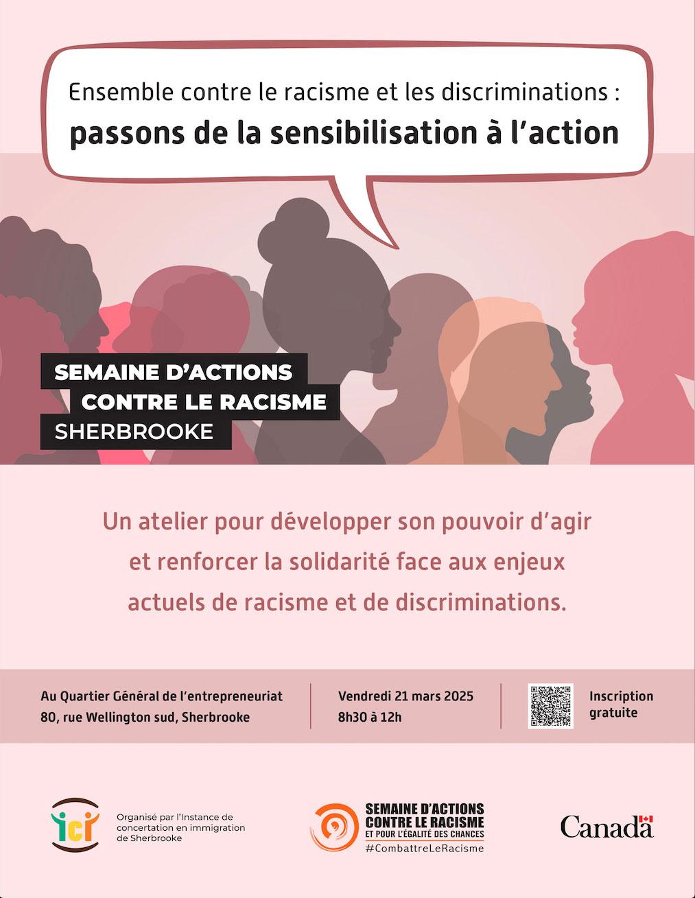 Description de l'activité : À l’occasion de la Journée internationale pour l’élimination de la discrimination raciale, et dans le cadre de la Semaine d’actions contre le racisme, les partenaires de l’Instance de concertation en immigration de Sherbrooke vous invitent à un atelier participatif pour renforcer la solidarité et passer à l’action face aux enjeux actuels de racisme et de discriminations.