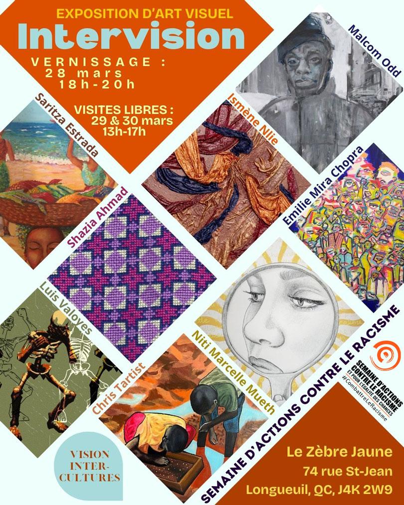 Description de l'activité : Intervision est une exposition d'art visuel rassemblant huit artistes de tous horizons pour la Semaine d'Actions Contre le Racisme en partenariat avec le Zèbre Jaune. Venez découvrir ces visionnaires et les dialogues entre leurs œuvres, ouvrant une conversation sur la richesse multiculturelle de nos communautés.