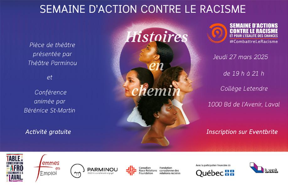 Description de l'activité : Femmes en Emploi en collaboration avec Théâtre Parminou, présente à Laval «Histoires en chemin». C'est une pièce poétique qui raconte les récits croisés de quatre femmes immigrantes, chacune provenant d’un coin différent du monde. À travers leurs histoires personnelles, elles évoquent leurs expériences d’exil, les difficultés de l’intégration, la recherche d’un nouveau foyer au Québec et les liens profonds qui les unissent à leurs pays d’origine. La pièce met en lumière des thèmes de résilience, de transformation et d’appartenance, tout en explorant les défis de la migration et la richesse des trajectoires humaines. Elle sera suivie d'un panel de discussion qui mettra en lumière les défis et les opportunités rencontrés par les femmes racisées sur le marché du travail.