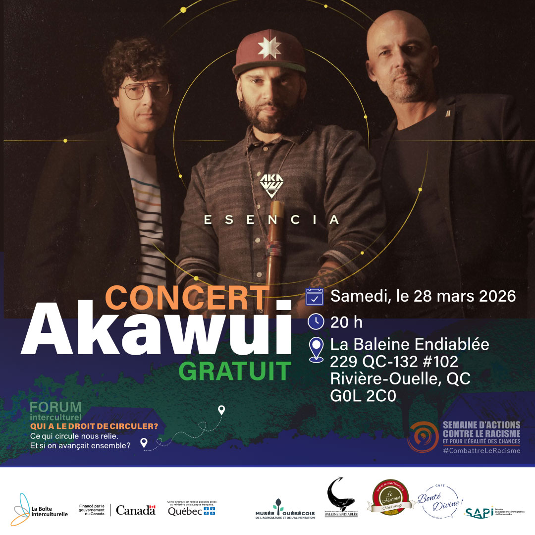 Description de l'activité : De New York à Toronto, du Maroc à la Colombie, de Montréal au Chili… et maintenant Rivière-Ouelle, Akawui présente ESENCIA, un concert immersif de 70 minutes où la musique retrace les grandes étapes de sa vie.