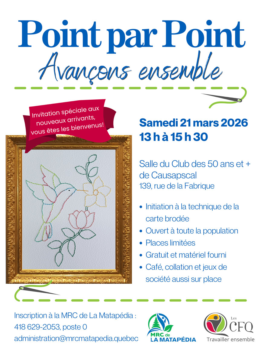 Description de l'activité : Organisée en partenariat avec les Cercles des Fermières de la région, la population est invitée à une initiation à la technique de la carte brodée. C'est gratuit, le matériel est fourni, mais les places sont limitées, donc l'inscription est requise.
